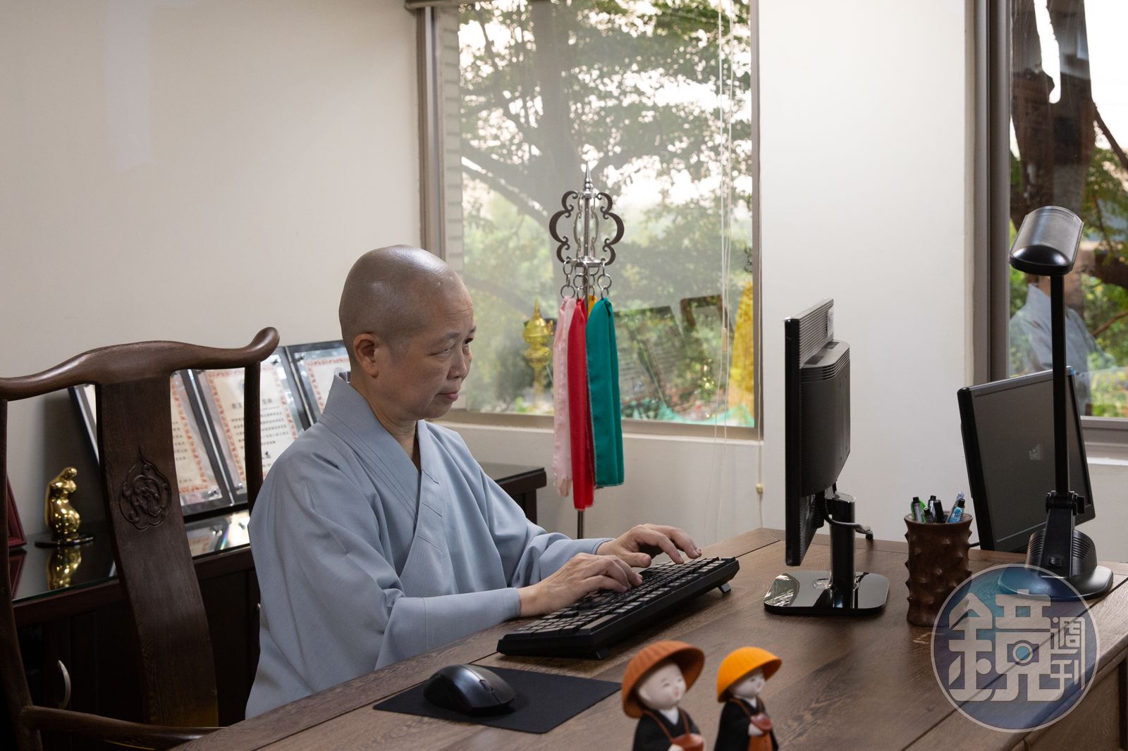 因為不需要龐大的財力人力,才感到自在,「但我也不至於很孤獨,旁邊還是有一群人,只是各過各的生活,做完一件事情又散開。」平常講課、誦經,夜半處理系務、寫論文,總是獨自工作,累了就休息,醒了就吃飯。如此,跟別人一樣,也不一樣。