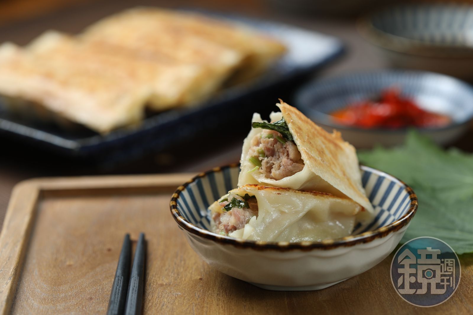 為了與主打傳統水餃、麵食的老店做出區隔,這裡以創意煎餃和乾拌麵吸客,最特殊的口味就屬「紫蘇葉煎餃」,王姈芸有次去日本旅遊,發現當地料理大量使用紫蘇葉,於是她嘗試包進水餃,但發現味道不夠強烈,改用煎餃作法,反而逼出香氣。不只散發清香,紫蘇葉還解油膩,吃來更爽口。