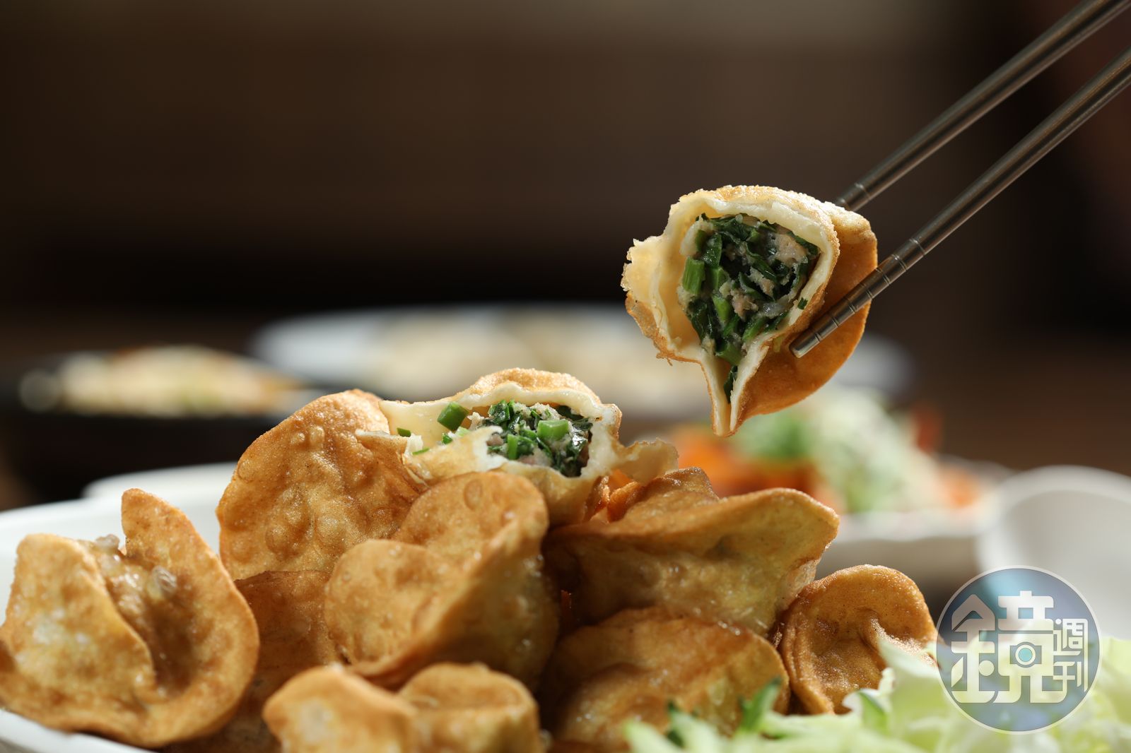 「我們在美式餐廳,發現什麼東西都能拿去炸,於是也試著把水餃下鍋炸。」黃雅雯笑說。起初直接炸,發現皮硬餡乾,於是先將餃子煮到5分熟,再用大火炸,不僅皮酥,還能保留餡料湯汁。