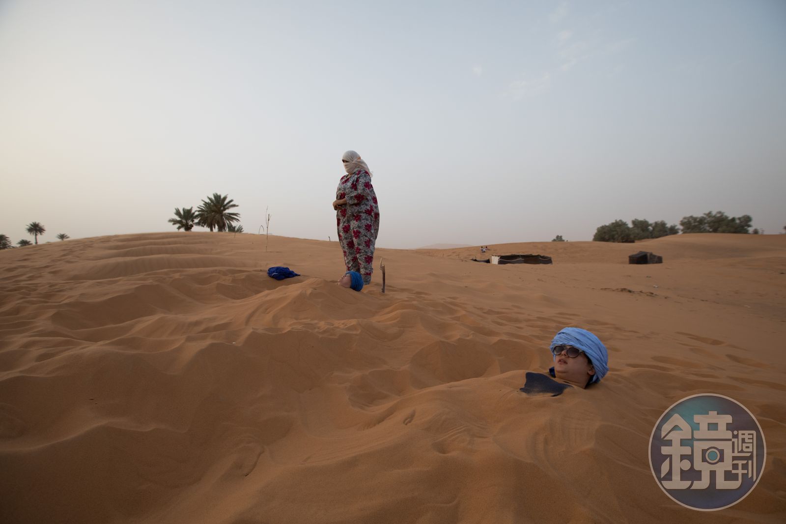 好不容易捱到傍晚,蔡適任與先生Lahbib帶我進入沙漠體驗夏季才有的傳統「沙浴」,這是夏季沙漠的特殊體驗,也是當地的傳統療法。車子開過沙丘,進入沙漠,左右出現幾個簡單帳篷。「等等我,幫妳找專門給女性的沙浴。」Lahbib下車,在帳篷間穿梭。
