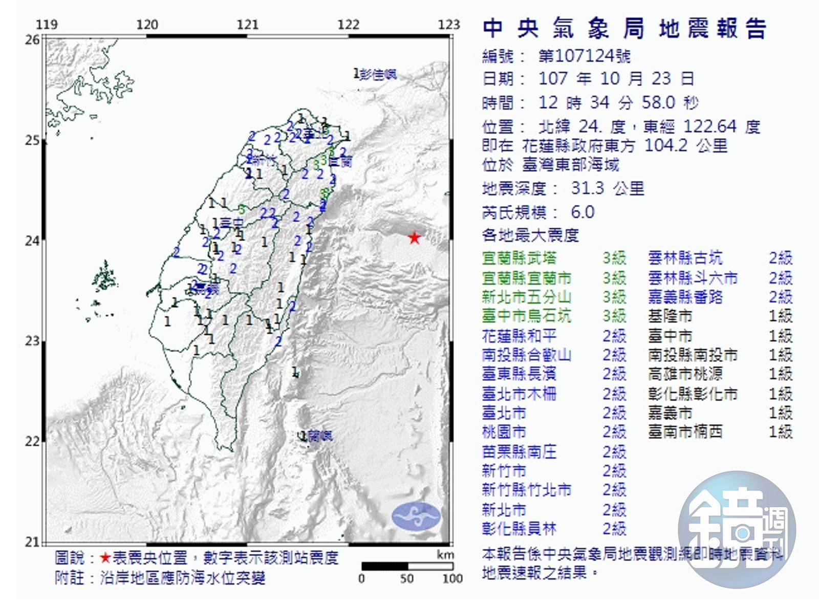 2018.10.23 12:53 臺北時間東部海域發生規模6.0地震 北捷一度停駛生活花蓮縣政府東方發生規模6.0地震(翻攝自氣象局)發布時間:2018.10.23 12:53 臺北時間更新時間:2023.09.12 20:28 臺北時間文 編務組主播智偉已複製連結贊助本文加入訂閱會員地震今(23)日12點34分東部海域發生規模6.0地震,地震深度31.3公里,各地最大震度為宜蘭3級、台北或新北3級、台中3級、花蓮2級、南投2級、台東2級、桃園2級、苗栗2級、新竹2級、彰化2級、雲林2級、嘉義2級、高雄1級、台南1級。 各地震度。(翻攝自氣象局)震央位於花蓮縣政府東方104.2公里、東部海域上,目前未有受災消息傳出,台北捷運一度停駛,國家級警報也在第一時間響起,提醒民眾做好防災準備。地震引起國家級警報,北捷一度停駛。更新時間|2023.09.12 20:28 臺北時間延伸閱讀【普悠瑪翻覆】搭車遇劫逃生 北原山貓「善事說」被罵翻貝克漢一家赴澳 英豪宅遭蒙面歹徒闖入《我可能不會愛你》日劇7年後翻拍 程又青、李大仁是他們梅根澳洲遇男粉絲 哈利衝出「你不可以送這麼大束花給我老婆」支持鏡週刊小心意大意義小額贊助鏡週刊!贊助本文每期 $35 元動態話題報導無限閱讀解鎖新鮮事加入訂閱會員鏡週刊加入追蹤訂閱下載鏡週刊加入追蹤訂閱下載更多內容,歡迎 鏡週刊紙本雜誌、鏡週刊數位訂閱、了解內容授權資訊。獨家深度分析報導線上閱讀