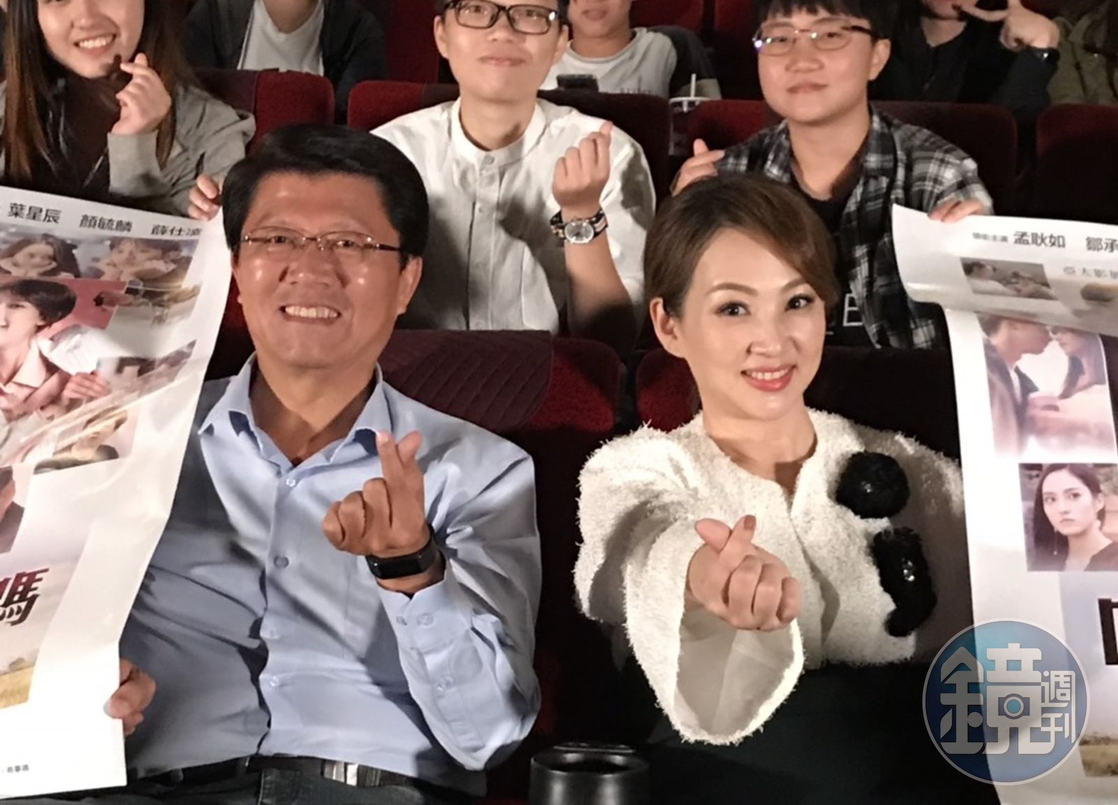 郁方與台南市議員謝龍介一起觀看電影《哈囉!有事嗎》。(一起影業提供)發布時間:2018.10.25 18:01 臺北時間