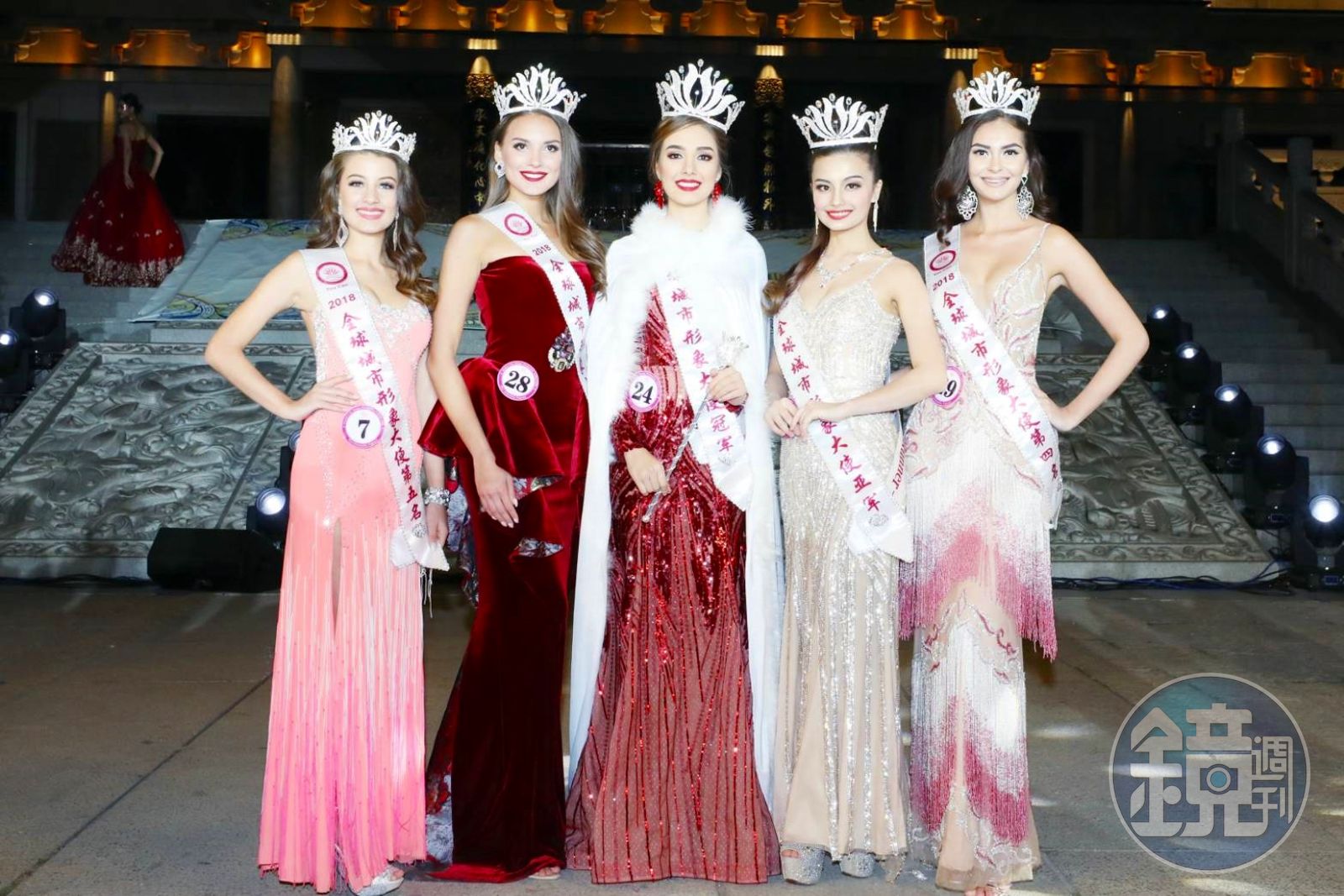 來自墨西哥杜拉哥市的Giselle Nuñez(中)拿下冠軍,亞軍是來自台灣的李棠霓(右二),季軍是來自俄羅斯莫斯科市的 Kamilla Khusainova(左二),第四名和第五名分別由巴西美景市Jessica Porto (右一)和南非約翰內斯堡Genive Trimble(左一)獲得。(全球城市小姐選拔協會提供)發布時間:2018.10.28 17:01 臺北時間