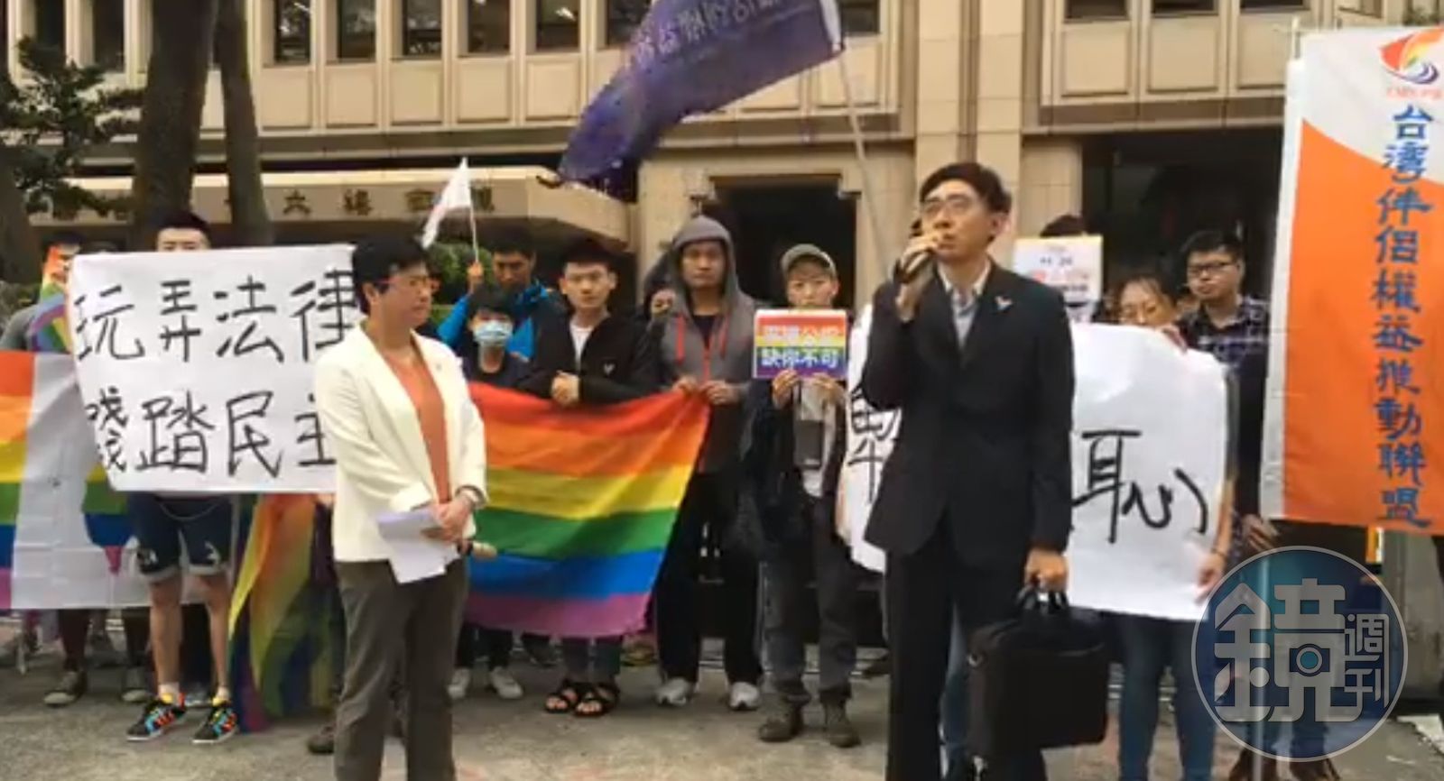 伴侶盟昨(30日)在中選會前舉行記者會,痛批辯論會出現正、反方來自同一陣營的荒謬現象,認為反同團體根本是在玩弄法律、踐踏民主。中選會昨晚通知,因為賓錦揚和簡月貞沒有在期限內提出電視辯論人選,因此第2場、第3場辯論已被取消,會由伴侶盟所代表的反方辦公室上場。但是伴侶盟指出,目前假反方仍有3場,「這是原則與是非問題,而不是場次多少的技術問題!我們不會也不該就這樣算了!」