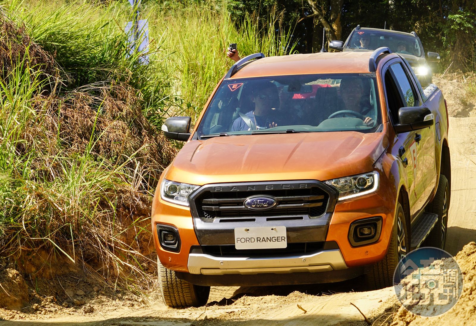 在教練的指示下,我們以4L模式前進,輕鬆的爬上了一個大斜上坡,並刻意放開煞車,此時HSA(斜坡起步輔助系統)自動將車子煞住三秒鐘不致倒退,駕駛可以從容的踩下油門上爬;接下來是許多的散兵坑與麥當勞(M)坡,按下電子式後軸差速器鎖定鈕,New Ranger擁有29 度進入角、22 度穿越角、以及 26 度的離去角,但即便數據如此漂亮,還是需要教練的一些提示與技巧輔助,如油門不要中斷、方向盤要轉動讓前輪吃進好的角度等;其中還有好幾段開到單輪懸空,但在電子差速器的自動介入下,脫困不過是數秒鐘後的事。