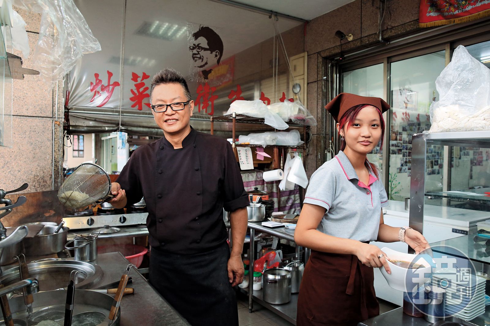 午間,忙碌餐台前,炒菜大衛牛肉麵老闆余建德正一臉嚴肅煮麵,全黑廚師袍襯得他兩鬢白髮越發顯眼,後方的紅髮少女接過他遞來的麵碗送餐,回以甜笑,余建德的表情才稍微柔軟,「我女兒國小就會自動幫忙,很懂事。」