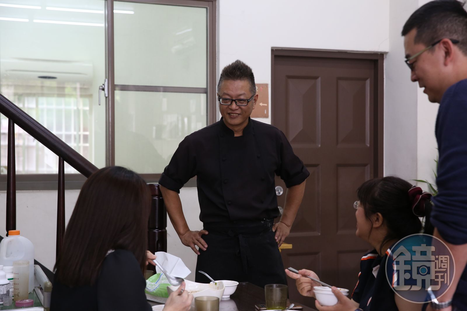 負責台中分公司的媽媽教室,余建德說菜色其實都不難,一個二十歲出頭的小男生如何招架十幾位婆婆媽媽?他妙回,「靦腆就好啦。婆婆媽媽都喜歡問,『你娶了沒?不然我女兒嫁你好不好?』我都回她們:『賣問這好某啦!(台語:別問這個好嗎)』,所以只要裝靦腆就好了,學起來。」
