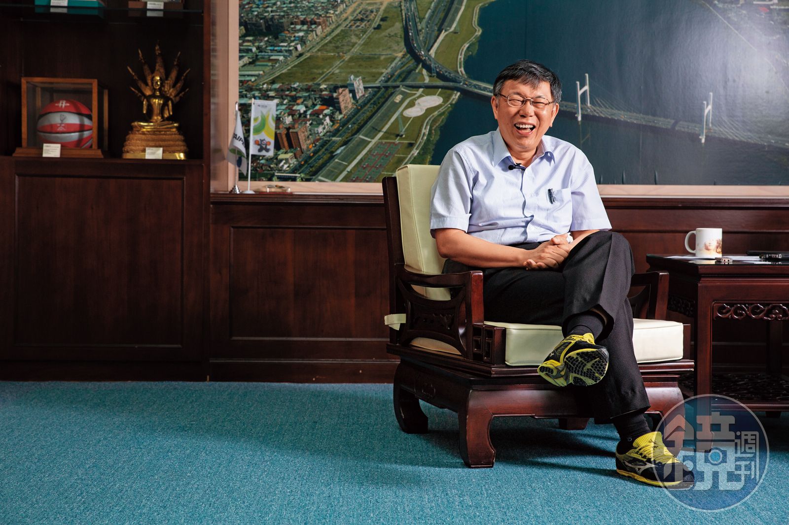 這天柯文哲的頭髮亂得像剛睡醒,問他要不要整理頭髮?「頭髮喔?太整齊就不像柯文哲。」上身是襯衫,皮帶拉到肚臍上,腳上穿著跑步鞋。「2015年去上海就是穿這雙。」他嘻嘻笑,說柯文哲在大陸的新聞,有1/10在談這雙鞋子。「這就是柯文哲搞笑的地方,故意的。」能否再約一次訪談?「你要問我的經紀人,我是演員,不是導演也不是編劇。」那經紀人給你的訪綱有沒有看?「訪綱我都有看,但我最大的問題是從來不按照劇本演出。」