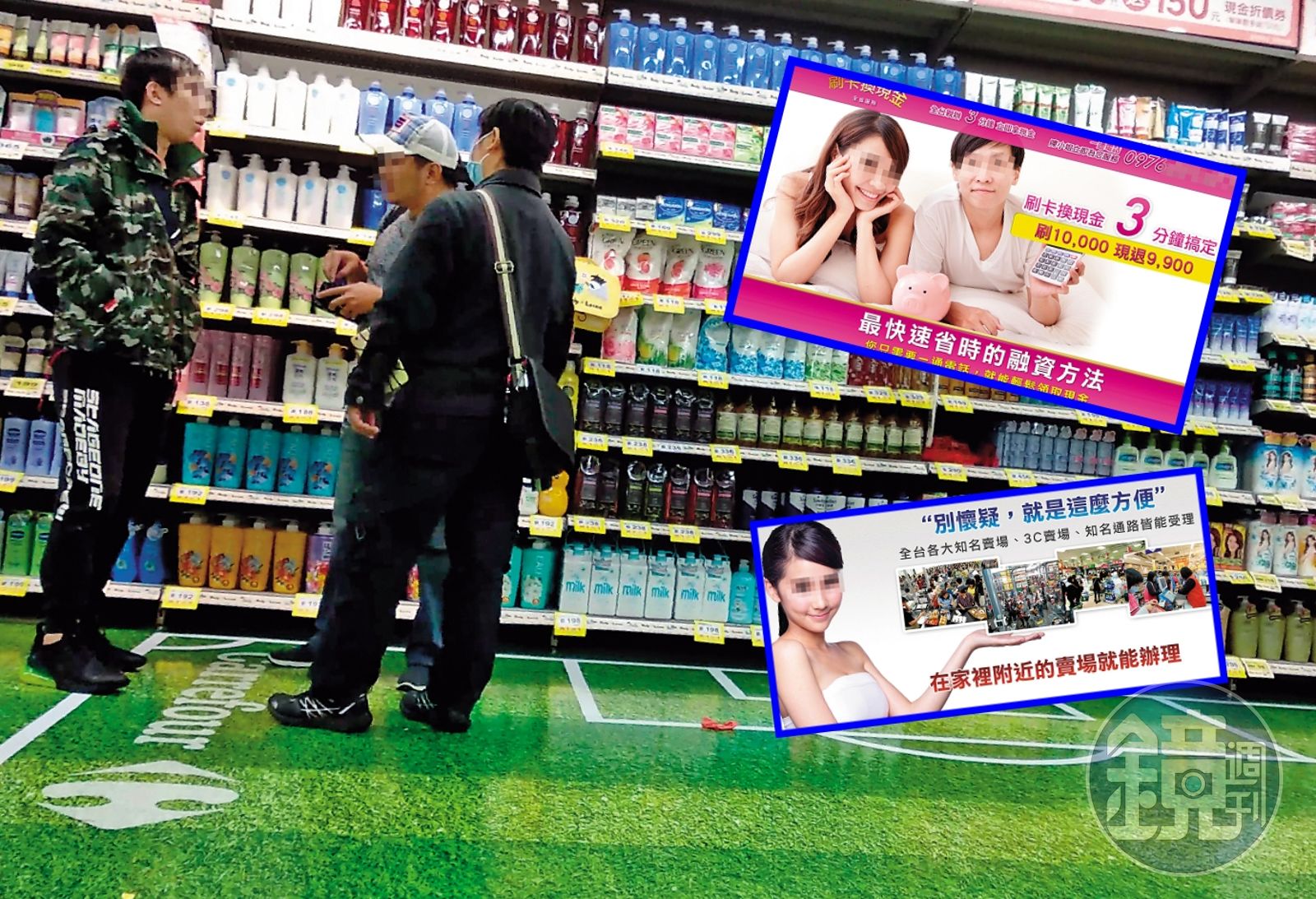 這時,A先生看到眼鏡男手上還有厚厚1疊禮物卡,便問對方是否都是刷卡換現金的成果?眼鏡男大方承認,說這是最省時、方便的融資管道,很多人無法向銀行、朋友借錢,也不敢去地下錢莊借,就會找他們救急,所以生意不錯,話一說完,眼鏡男就搭電梯到停車場開車離去。