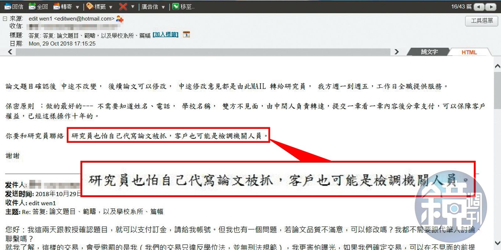 販賣毒品都還得見面交貨,花10萬元買一篇論文,竟然三方只能透過電子郵件聯繫,甚至記者主動留下電話,對方也從不回電,如此神祕兮兮,可見,業者也自知幹這種勾當,完全見不得光。