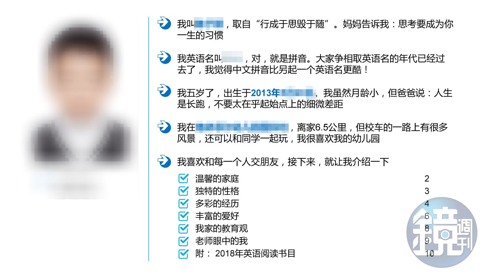 中國大陸一名男童申請小學的15頁簡歷在網路上爆紅,年僅5歲的他,因父母皆是畢業於復旦大學的高材生,因此自稱是「復二代」,根據簡歷資料,他原文書的年閱讀量達500本,還有圍棋、鋼琴、足球、主持等十多項才藝,曾周遊國內外超過30個城市。簡歷還附上性格分析,強調他「耐挫、敢拚」,喜歡刨根究柢、熱愛做實驗,每週還寫3則英文日記。簡歷一曝光,立刻引起中國網友熱烈討論。