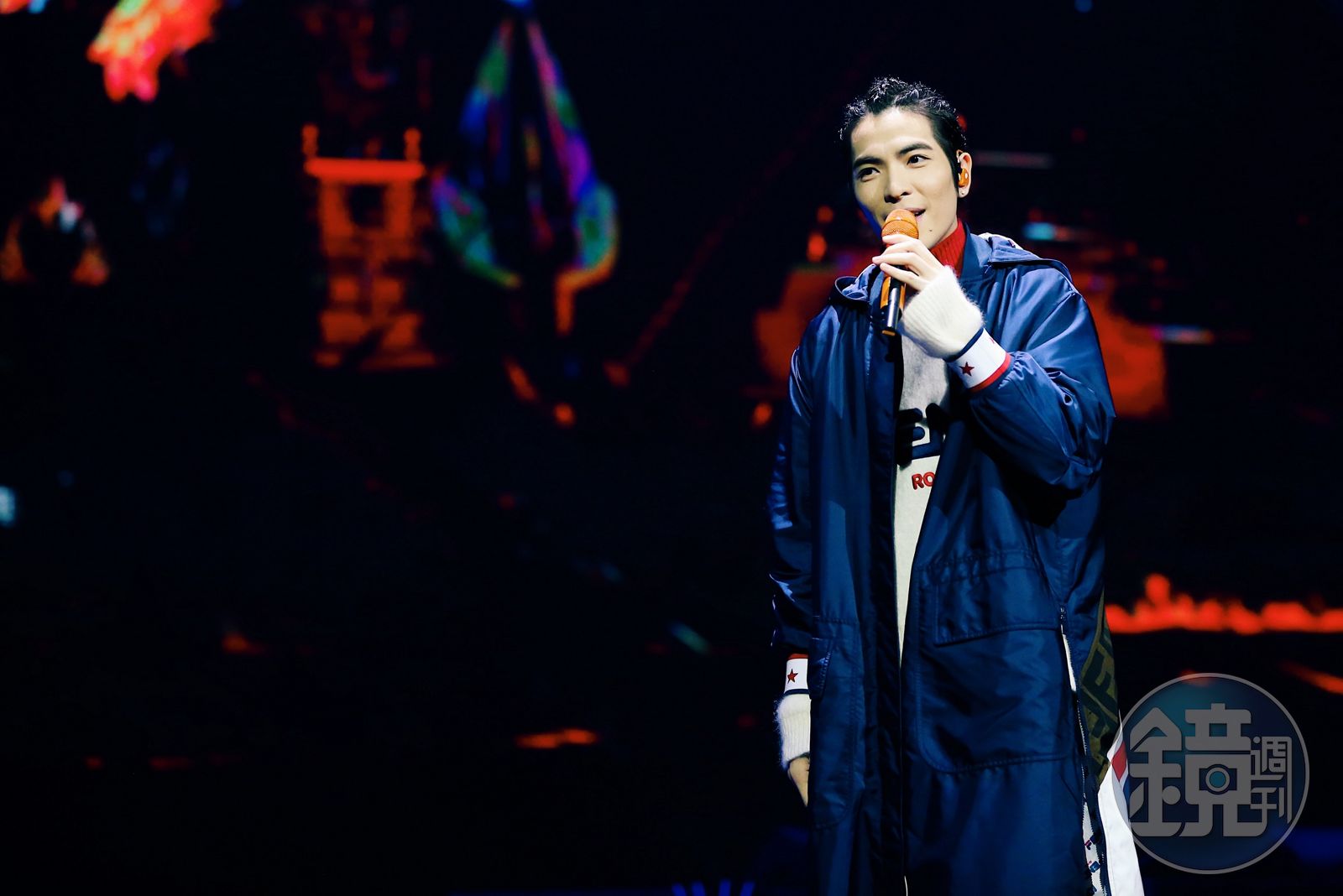 他穿著FENDI MANIA快閃系列長版大衣登台,這個由FENDI與英國藝術家Hey Reilly合作推出的系列,以1980年代極為熱門的FILA運動服裝為靈感,將FILA的黃黑、藍紅色logo翻玩,設計出令人驚喜的街頭風作品。