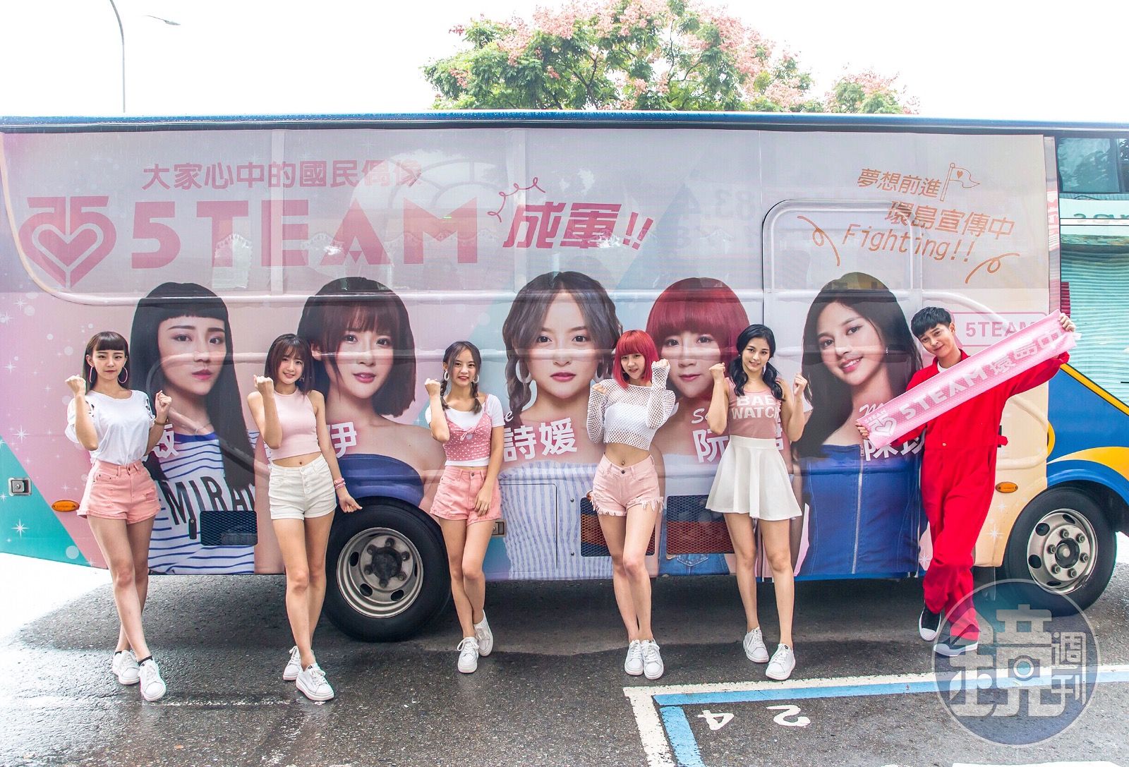 5TEAM搭乘專屬巴士跟國民哥哥莊傑評一起環島,第一天到達九份老街,天空不作美下起滂沱大雨,5個小女生只好一邊淋雨一邊完成宣傳任務,精通英文的典薇、流利日文的詩媛和會一點韓文的苡瑄,成功擄獲8組外國遊客的心,紛紛拿出手機在紛絲專頁支持按讚。