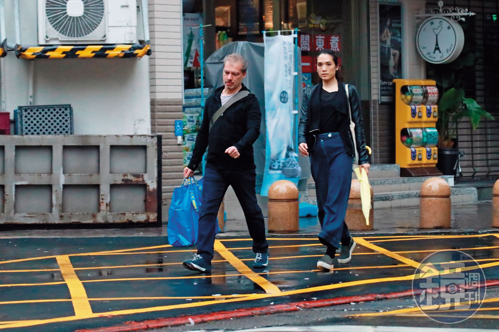 10/26 22:14 本刊直擊馬塞爾與連詠心在回家的路上突然下雨,連詠心挽著丈夫的手小跑步過馬路。10月26日晚間,本刊記者隨同參與座談會,只見馬塞爾穿著條紋襯衫與牛仔褲出席,連詠心也混在人群中參加,結束座談後,原本2人準備相偕到捷運善導寺站搭車,卻突然下起大雨,連詠心便挽著老公的手,小跑步過馬路改搭公車回家。