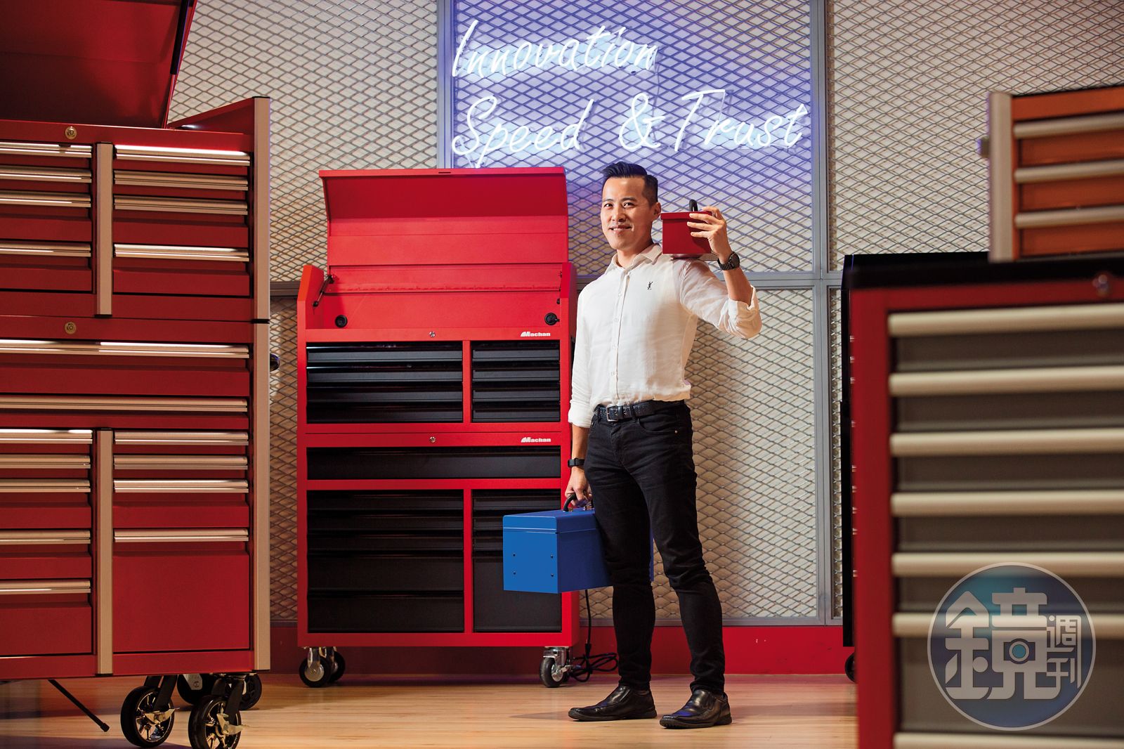 從小型的隨身工具箱,大至被稱為「男人廚房」的半人高工作站,張秋龍都接單。他引進塗裝生產製程、塑膠製品製程的產業水平整合,靠著物美價廉的品質,搭上歐美居家DIY的風潮,很快在市場上站穩腳步。