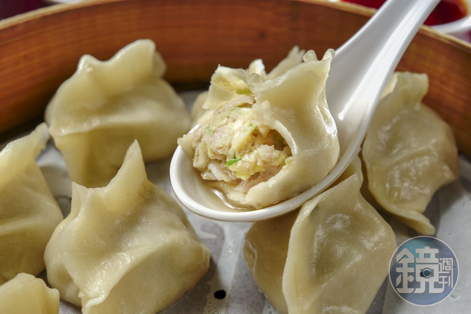 餃子皮要自己和麵糰、現擀現包,「手擀的皮才會中厚邊薄,餡料掐進去時才不易破,收口處也不會太厚而影響口感。」陳學富解釋。內餡食材也講究,溫體黑豬的後腿肉、梨山高麗菜、宜蘭三星蔥,豬肉肥瘦3比7、菜肉1比1的黃金比例更是關鍵,另外還拌進雞豬骨高湯,讓蒸餃有如小籠湯包,一口咬下爆出鮮美湯汁。