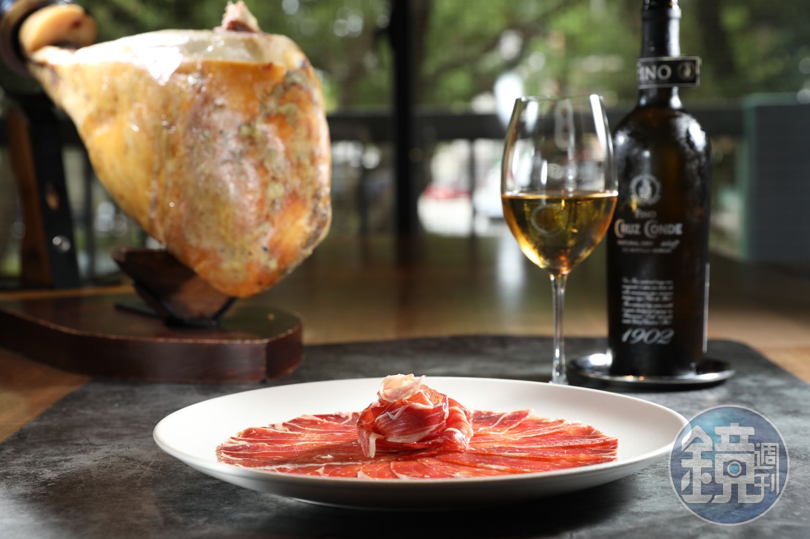 「西班牙Bellota等級36個月風乾伊比利生火腿」在我面前如花綻放,取一片入口,油脂上特有的結晶,釋放出濃郁脂香,David遞上一杯來自西班牙「克魯茲伯爵莊園未加烈FINO」說:「地酒搭地食,FINO搭西班牙生火腿最經典。」我把杯口湊近鼻尖,嗆出陳年紹興味,沒想到一喝反轉,中和油脂膩感、清洗味蕾不說,更在其中穿針引線,把唾液誘引出來,惹人齒頰生津,直想再來一片,經典CP美名當之無愧。