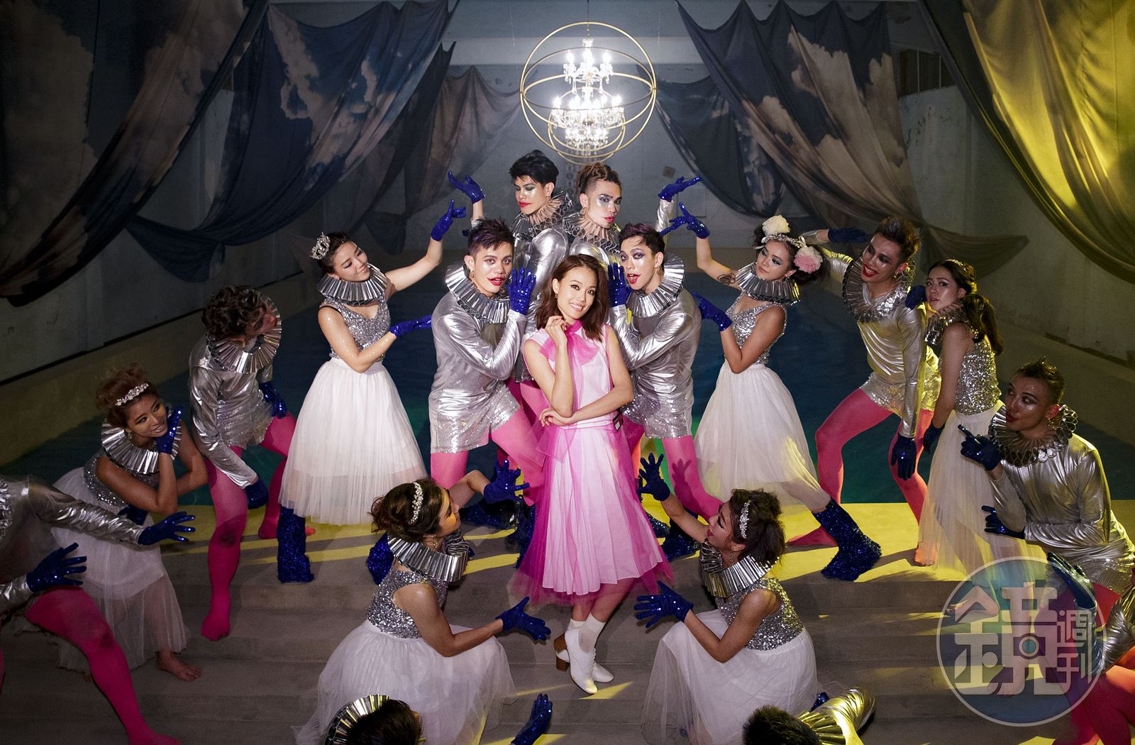 〈綁夢〉MV請到33位舞者一同入鏡,非常有氣勢。(英皇娛樂提供)當初配唱時魏如萱特地挺著孕肚探班,義氣留下來陪容祖兒唱到完,容祖兒表示:「非常謝謝娃娃的創作,又那麼挺我,真的恭喜baby這麼帥氣,敲碗等吃油飯囉!」