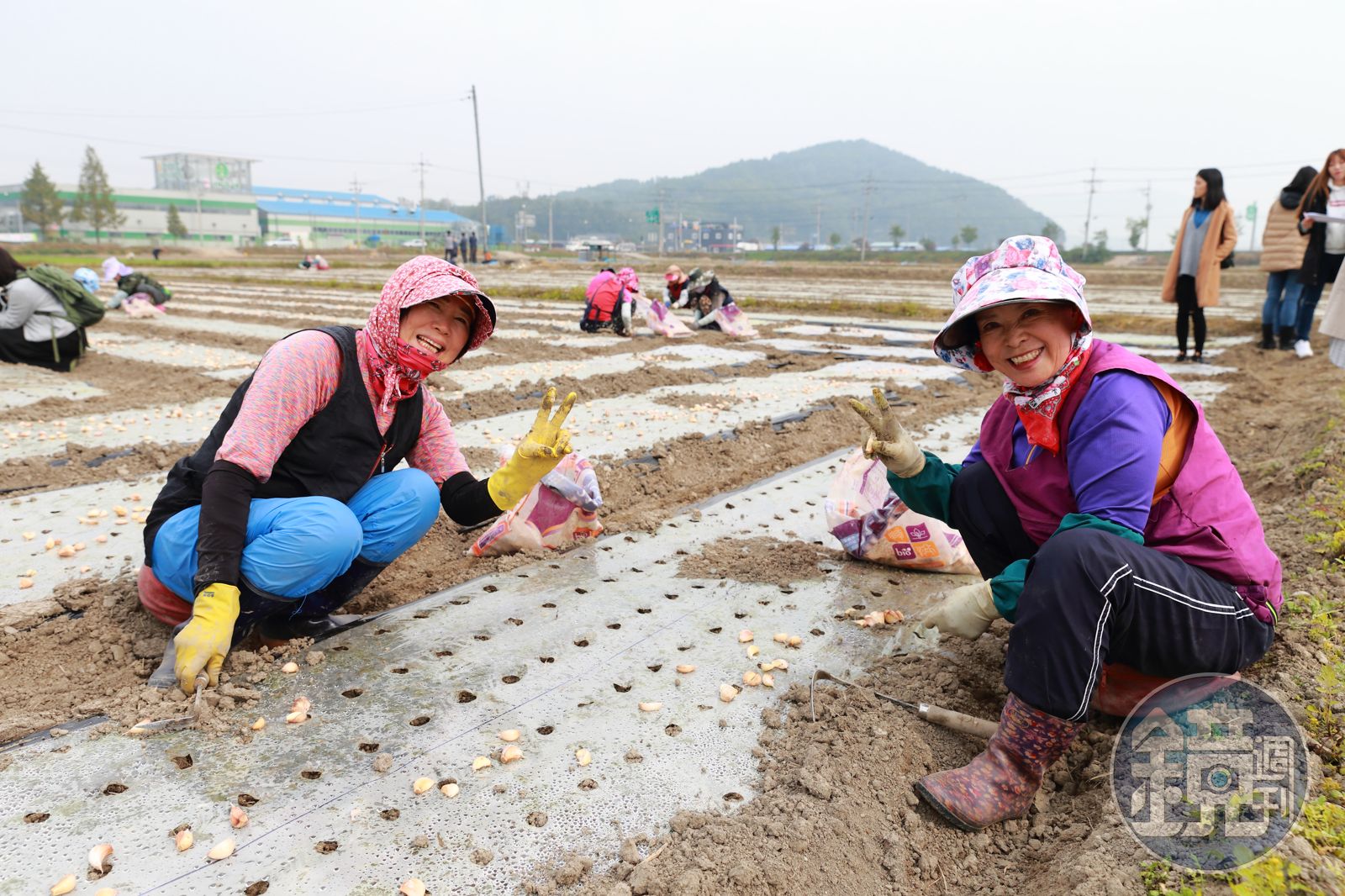 每年9、10月栽種,5月末至6月初採收,一年僅一種一收,收成的大蒜會先入倉,並控制溫、濕度,細心保存。我們正好在10月下旬造訪,田野一望無際,還是光禿禿一片,正值播種季節,只見農人們彎腰、一手掘洞、一手快速放入蒜瓣,用暱稱為農活神器、綁在屁股上的小綁凳迅速移動,兩、三人一組,迅速就種完了一排。