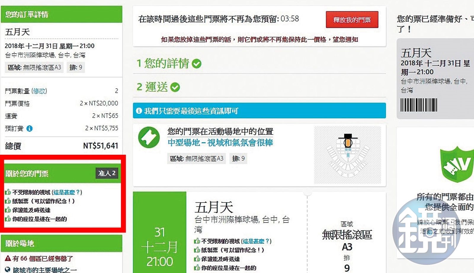 以下個月五月天跨年場搖滾區的門票為例,不到5,000元的門票在該網站要價20,000元,還會不斷提醒「票券即將售罄」,要消費者盡快付錢,直到選定付款方式後,左側的明細表才會新增5,755元的預定費,加上65元的運費,單張原票價只要不到5,000元的門票,最後變成25,800元,相當於官網訂價的5倍。