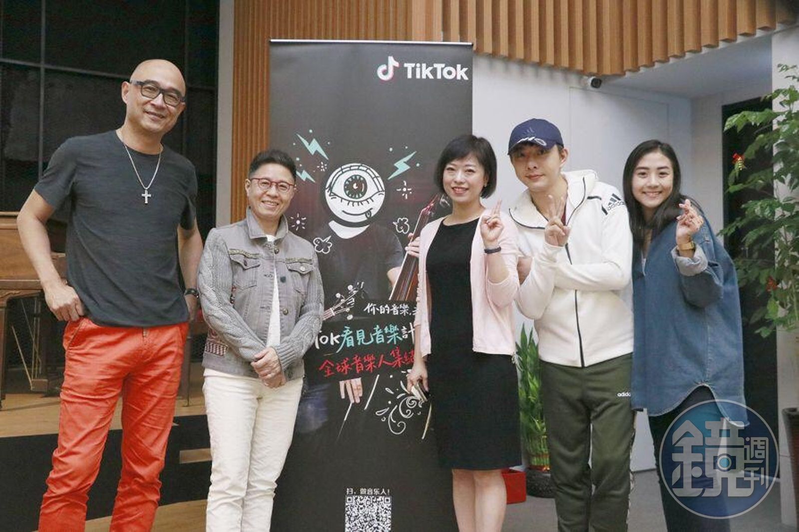 「抖音」日前來台宣傳音樂活動,請來賓陣容堅強,左起:王治平、丁曉雯、中國字節跳動科技負責人朱潔、星之田文化總監陳孝志、李柏萱。(陳孝志提供)發布時間:2018.11.14 18:39 臺北時間