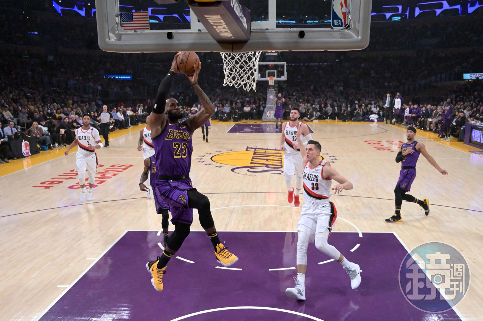 面對戰績更佳的強敵拓荒者,今(15)日湖人開場團隊命中率低迷,甚至連詹姆士也只攻下5分,湖人以33比26暫時落後。第2節湖人逐漸找回手感,場內下起凶猛三分彈雨,詹皇一人就包辦了3顆,也幫助球隊以59比55逆轉超前。