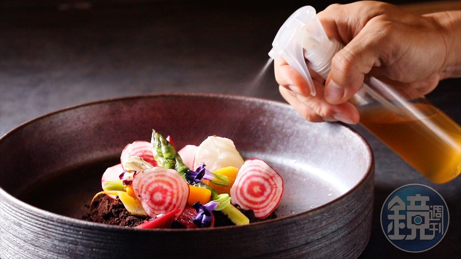 因為「蜂蜜」這個元素,給了他大自然循環、生生不息的靈感,大地之母是土壤,而根莖類蔬菜是最貼近土壤的養分,於是他以黃甜菜、糖果甜菜、櫻桃蘿蔔、蘆筍、迷你蘿蔔等5種根莖類蔬菜,分別以醋漬、生吃、爐烤、水浴及炭烤等處理方式來烹調。