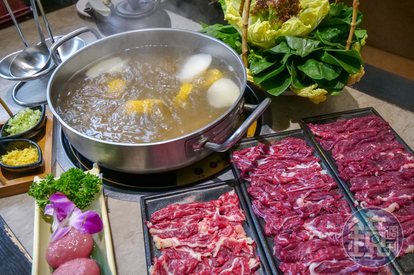 湯頭剛端上桌,略呈黃色,先喝一口湯即品嘗原味,以牛骨、南薑、蔬菜及蒜頭熬煮6小時而成,入口非常清爽,帶點鮮甜味,很適合搭配牛肉。由於潮州本身不產牛,這裡選用草原地區的放牧小黃牛,牛在充足的運動之下,肉質也特別有韌性。