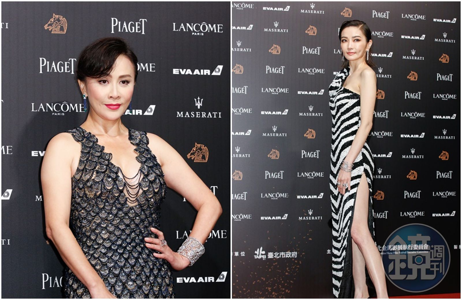 鞏俐則是輸人不輸陣,一身亮色禮服搭配黑色花紋,即使全身包緊緊,胸前曲胸和臀部曲線卻異常雄偉,和劉嘉玲、曾美慧孜一樣都帶著魚類的意象。