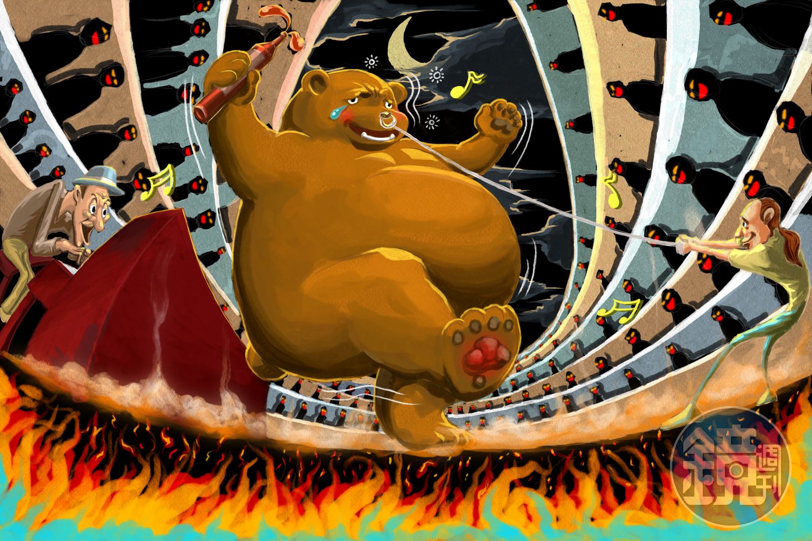 奇幻小說「黑暗元素三部曲」系列《黃金羅盤》中的武裝熊,原本力大無窮,拔樹撼山;卻淪落到窩在酒吧後門外,趴在水桶邊,灌別人喝剩的殘酒,把自己力量來源的武裝拿去換酒喝,周圍人們對牠既戒懼又鄙夷。此時一陣惡寒,我發現原來武裝熊就是跳舞的熊。酗酒是強大力量受困的具體表現,在《小王子》中,小王子問酒徒為什麼喝酒,他回答,喝酒是為了忘記恥辱。什麼恥辱?他回答,喝酒可恥。