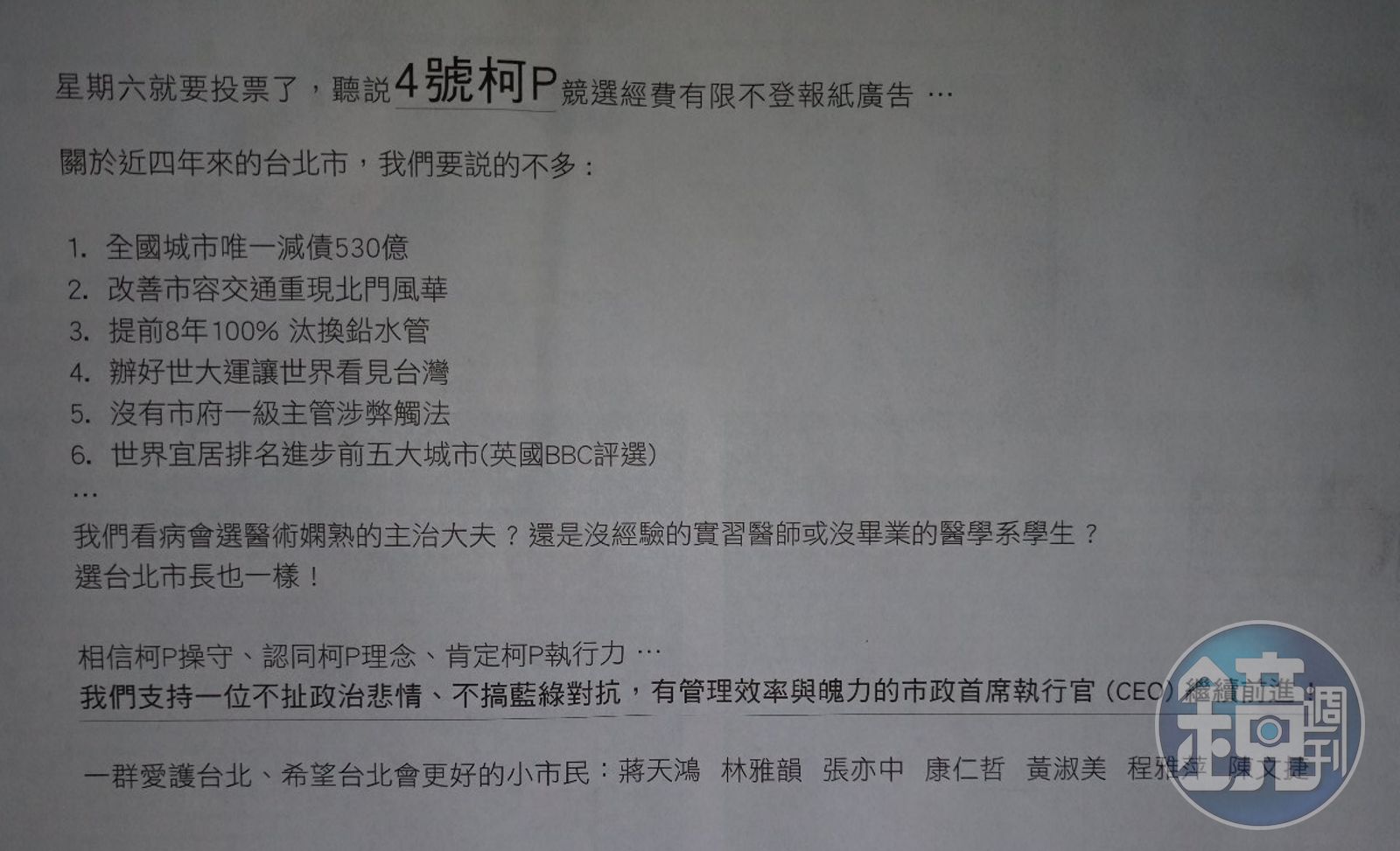 廣告內容還反問讀者,「我們看病會選醫術嫻熟的主治大夫?還是沒經驗的實習醫師或沒畢業的醫學系學生?選台北市長也一樣!」廣告最後不忘再次強調,「相信柯P操守、認同柯P理念、肯定柯P執行力…我們支持一位不扯政治悲情、不搞藍綠對抗,有管理效率與魄力的市政首席執行官(CEO)繼續前進!」