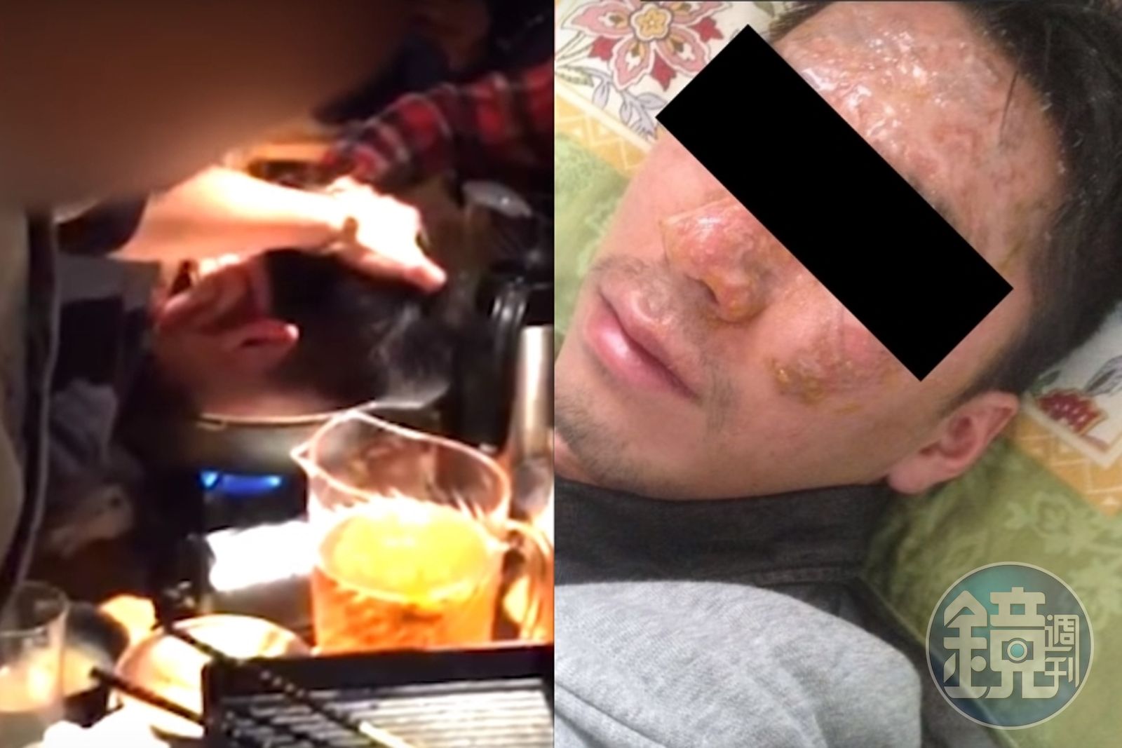 員工被社長以「取悅客戶」為由,將他的頭浸在鍋裡,造成他遭嚴重燙傷。(翻攝《週刊新潮》YouTube)發布時間:2018.11.21 13:00 臺北時間