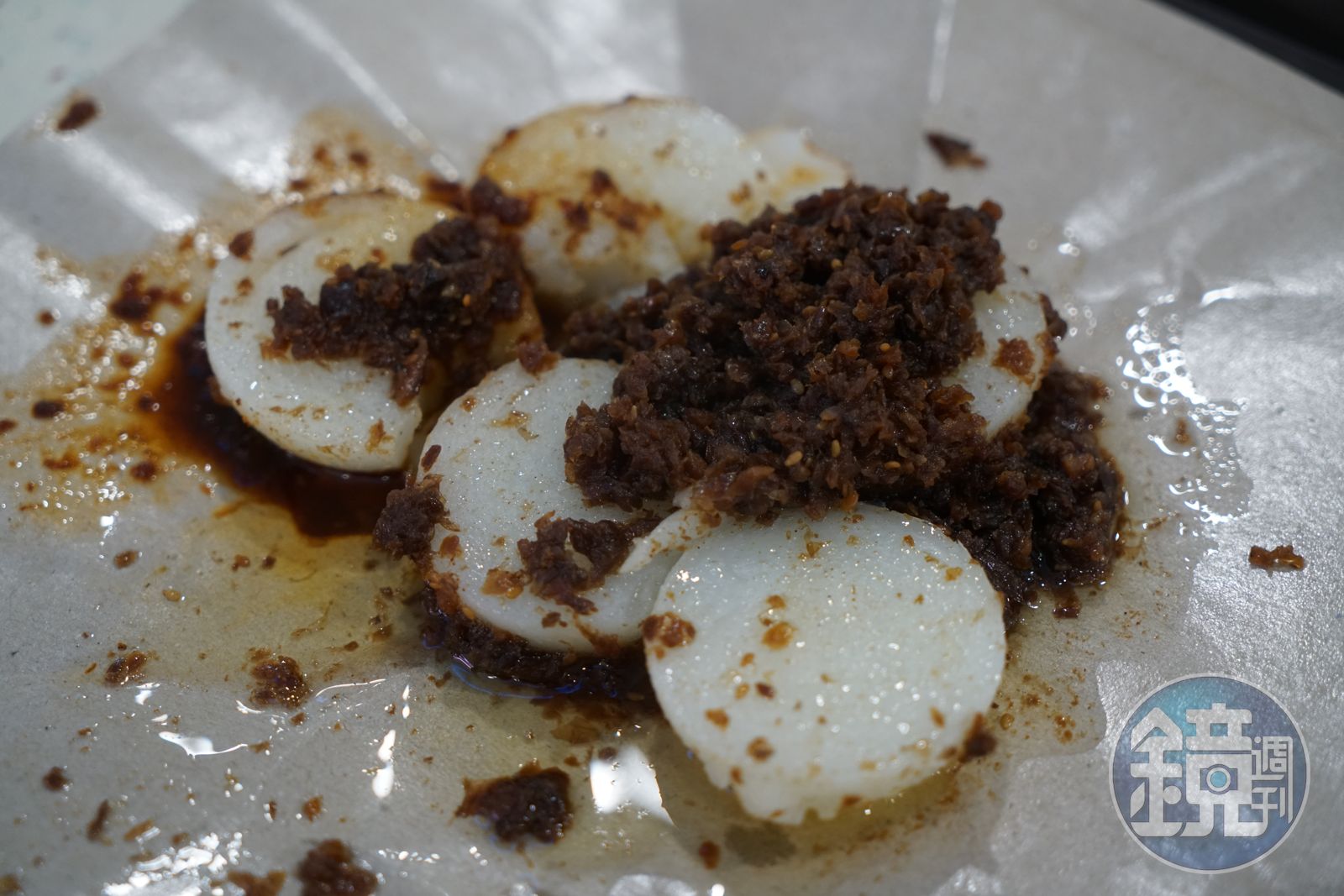 我覺得它吃起來,有點像台南碗粿的口感,但味道就只有單純的米甜,因此淋在上頭的菜脯醬,是鹹味的來源,還帶一點甜、一點辣,非常夠味,真的是款看起來不起眼,但一吃會驚豔的小吃啊!