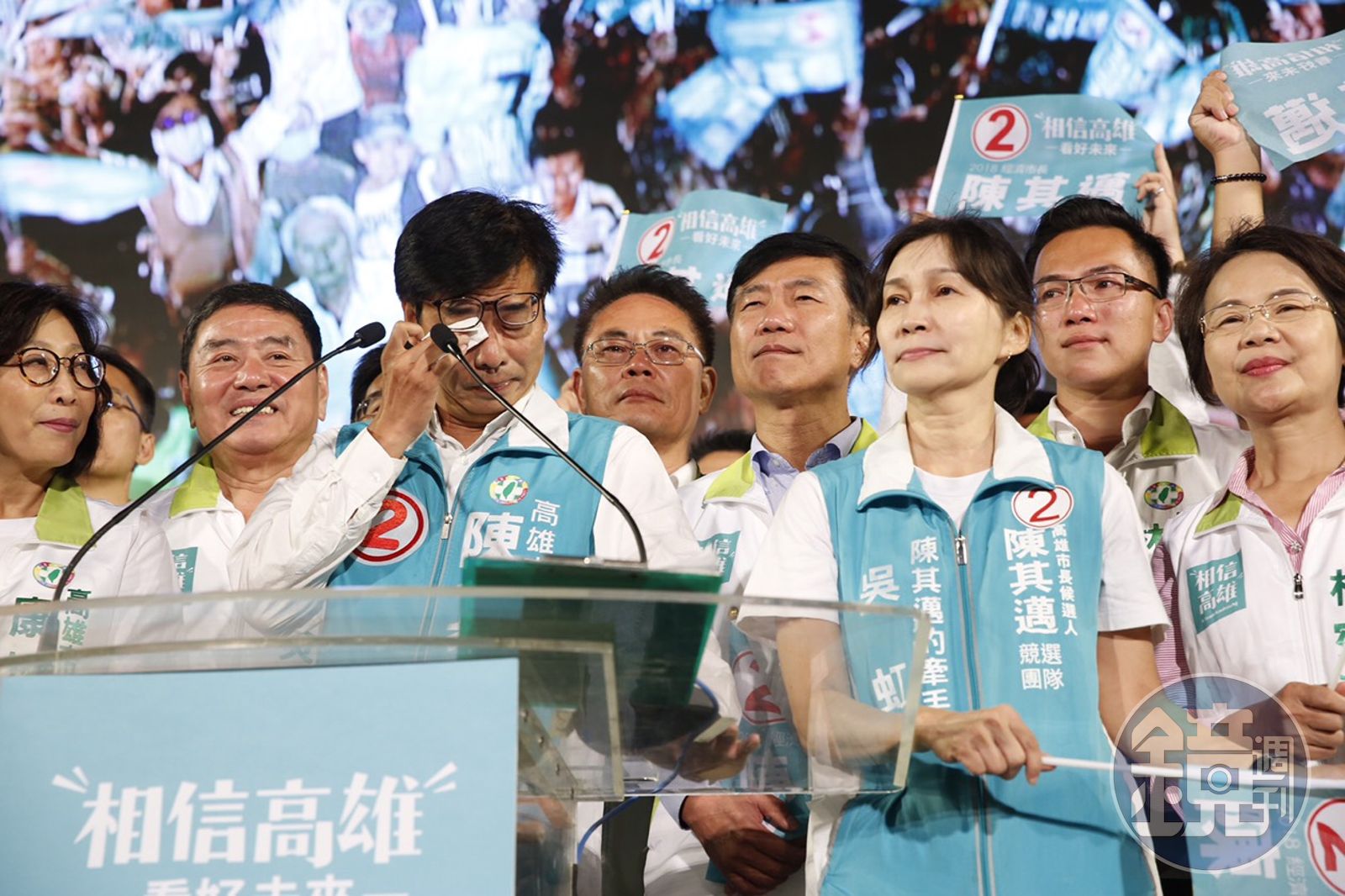 高雄前市長、總統府祕書長陳菊到場說,國民黨選得這麼搖擺,讓民進黨的市長、議員選得喘噓噓,社會怎麼會有公義?今天到場的都是歷史的見證者,因為20年來高雄從一個汙染、工業城市,變成現在大家感到有光榮、有自信、適合世代居住的高雄,要見證這些努力能不能化為選票,要支持陳其邁,為高雄討回公道。