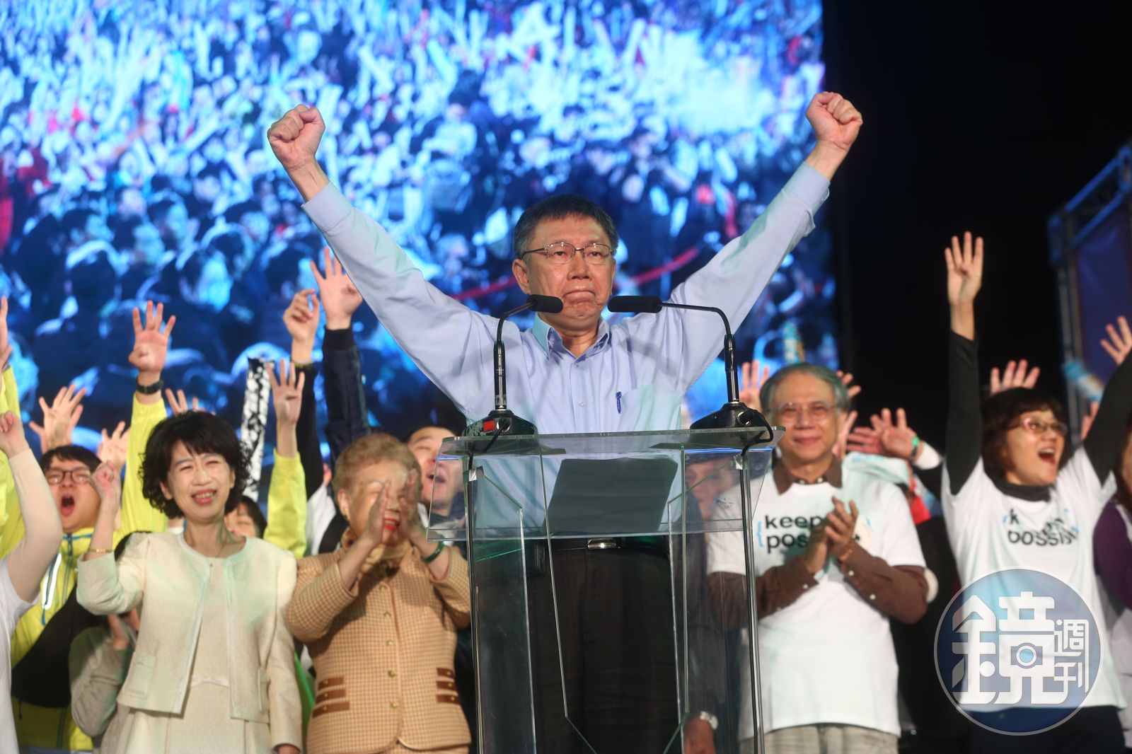 柯文哲約在晚間9點03分由廣場外圍進場,群眾沿路尖叫高喊,柯文哲走了15分鐘才抵達舞台。柯文哲致詞中後段,一連高喊6次「出來投票」,他說,出來投票,投給堅持改革的政治信念;出來投票,投給公開透明的政治文化;出來投票,投給可長可久的銀髮照護系統;出來投票,投給讓青年可以安身立命的公共住宅;出來投票,讓軸線翻轉的門戶計畫可以實現;出來投票,投給決不債留子孫,永續經營的市政理念。