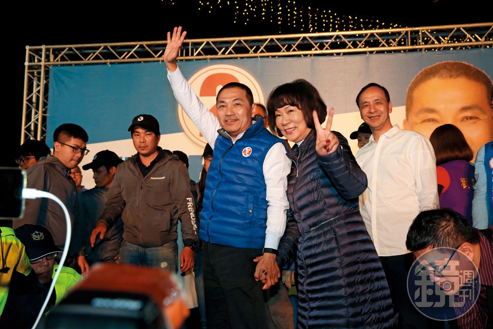 侯友宜一直到晚間9點20分才現身。不到50公尺的路,走了將近3分鐘,好不容易上了台,現場大螢幕卻一度只剩媒體高舉的攝影機,擋住身形本就不高大的他。台上有人大喊:「請退到台下!」僵持近30秒,被主持人形容為「講話憨慢,但是金實在」的侯友宜終於現身。