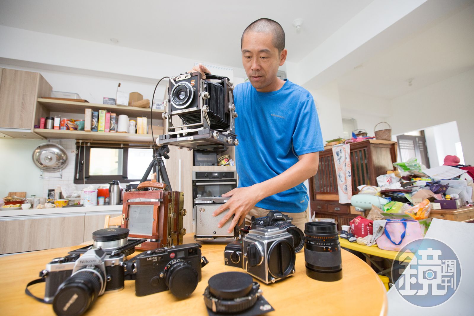 趁著採訪空檔,鍾順龍難得在鏡頭前,拿出幾台近年他慣用的相機,不過幾分鐘,立刻擺滿了整張桌面,宛如軍力展示。