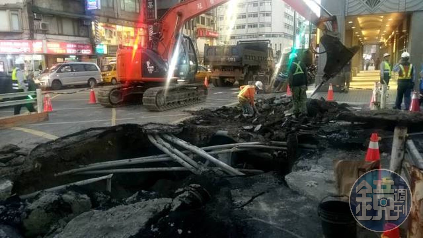 北市吉林路口傳坍塌,碩大天坑造成小貨車掉落。(翻攝畫面)本刊調查,去年4月八德路、光復北路口也曾發生地層下陷,原因是台電進行潛盾工程時發生疏失,導致路面坍塌,緊急以「灌漿」填補方式處理,暫緩災情擴大。但目前台電提交交通恢復計畫遭北市交通局退回,導致該潛盾機還在路面下,現場也還存有塌陷的隱憂。
