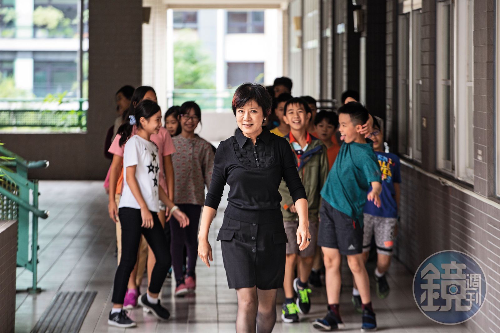 上課鐘剛響,台北市新生國小5年2班已沿走廊分為2列,安靜走進英語專科教室,向門口穿著黑色套裝的老師致意,李以敏優雅回應眾人,彷彿她還是官夫人,正上街為參選台北市議員的教授丈夫拜票。