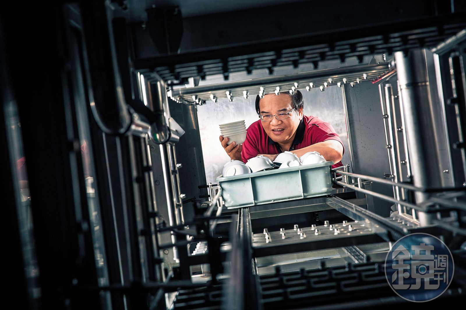 他帶我們去看這些碗怎麼洗,一眼望不完的是一座長達30公尺的超大型洗碗機,像條鋼鐵巨龍貫穿廠房。巨龍體內正轟隆隆進行著七槽式、從90度到50度不同水溫的高壓洗滌,輸送到後端還有6段式高壓風乾,整條產線每分鐘可洗出1,200個小碗。