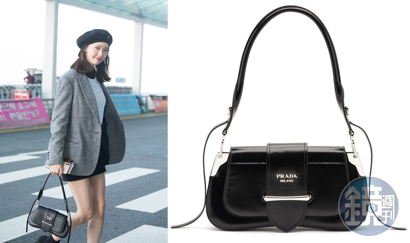 潤娥上月來台出席見面會時,一身素雅的黑白裝扮下,套著具今年流行指標的格紋西裝外套,手上的黑色曲線行手袋,即是PRADA Sidonie包款。她選擇全黑的簡潔色調,一如她的造型look,與台灣女星較偏好的黑白撞色肩背包款不同。