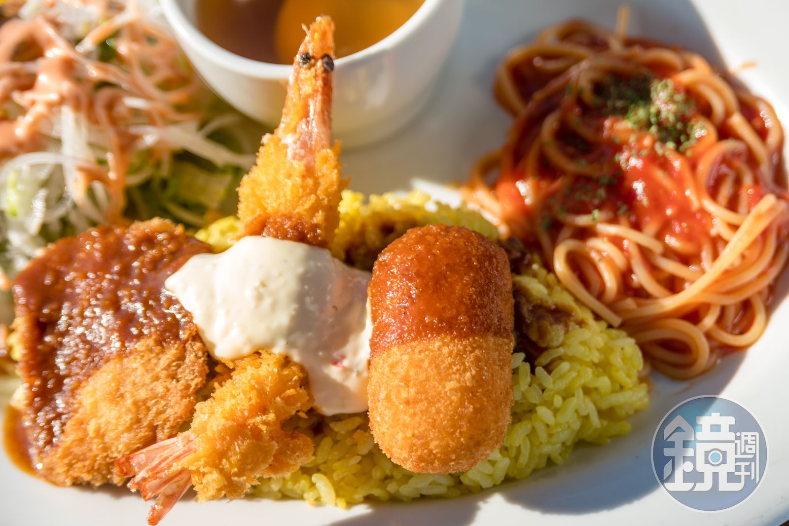 在長崎的洋食店裡,幾乎都能看到這一款「土耳其飯」,裡頭包含三大主角:義大利麵、炸豬排、番紅花飯或咖哩炒飯,這種麵加飯的設計概念,基本上跟日本人喜歡澱粉配澱粉的習慣有關,幾乎所有拉麵店裡都會賣白飯、炒飯,讓客人配著吃。