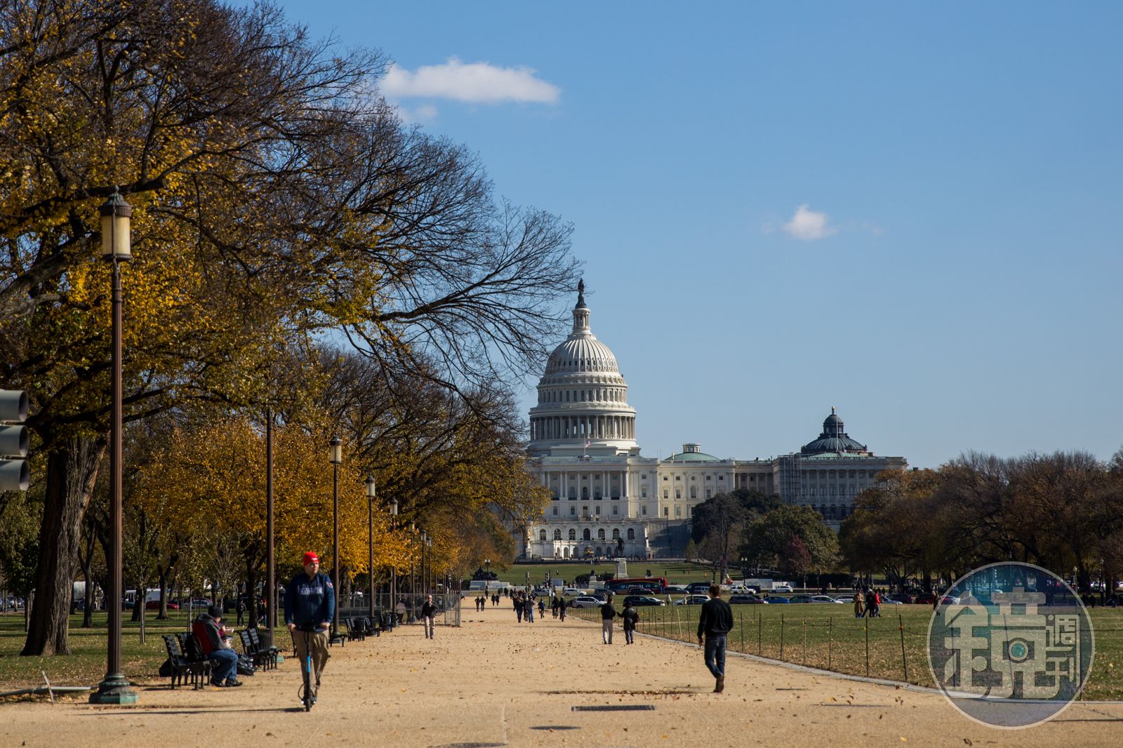 有人稱市中心四角各據一方的國會山莊、華盛頓紀念碑、林肯紀念堂、傑佛遜紀念堂這四大重點地標建築為「首府的十字架」。平日戒備森嚴的中央地帶,在我拜訪之時,正逢秋紅時節。紅黃橘色彩繽紛的顏色,也似乎將純白建築染色,由其隱藏在周旁樹林內的韓戰老兵紀念碑,19名士兵在林中抗敵前進的模樣,遇上秋風起,國旗飄揚,眼前紅葉被吹出颯颯聲響,竟顯現出些微浪漫情懷起來。