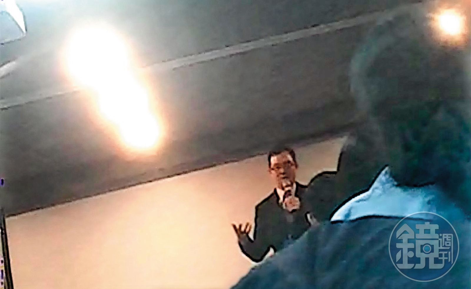 1名身穿西裝的中年男子接下麥克風,搭配投影螢幕向台下聽眾介紹所謂「百年難得一見」的快速致富機會。