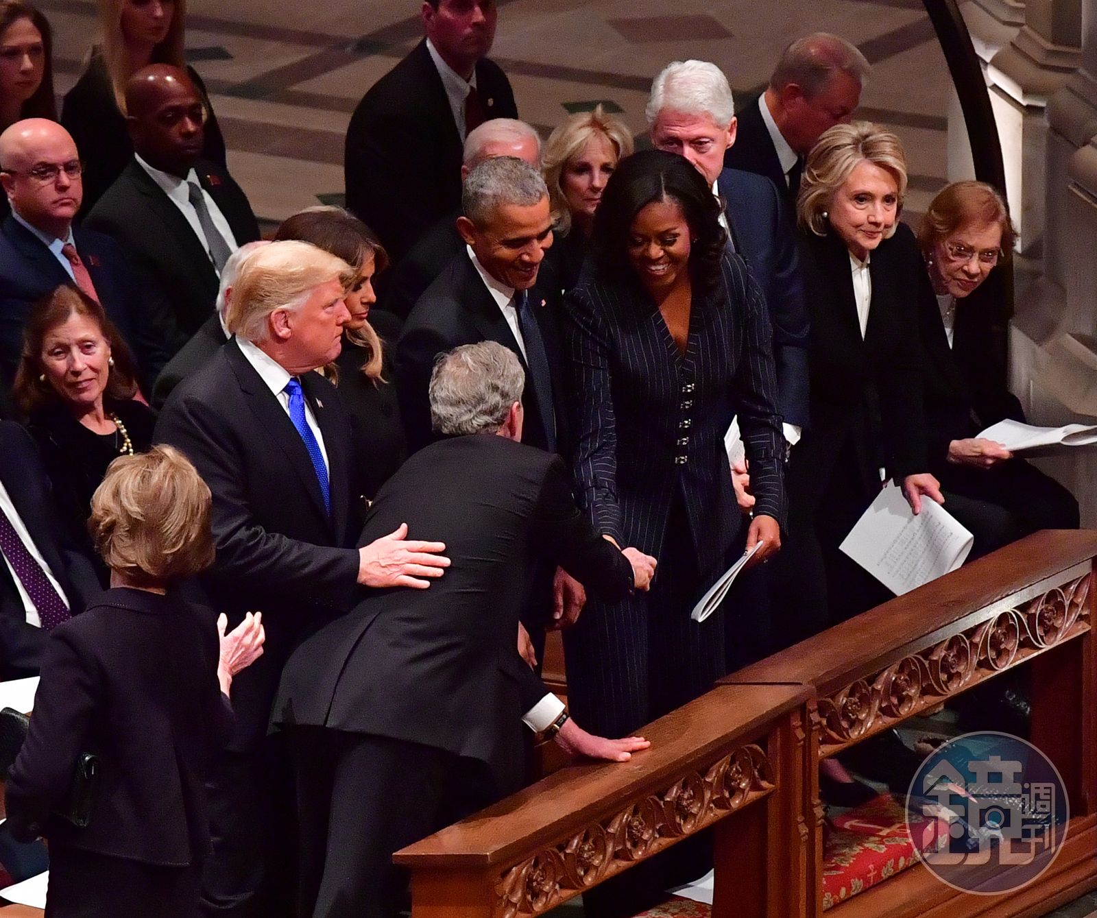 老布希的葬禮也是川普上任以來,首度與歐巴馬、柯林頓、卡特、小布希4位前任總統同時會面。(東方IC)特別的是,當小布希入場後,他與川普打招呼後,居然拿出糖果給前第一夫人蜜雪兒.歐巴馬,彼此臉上也露出溫暖笑容。其實今年9月資深共和黨參議員馬侃(John McCain)葬禮時,當時小布希坐在蜜雪兒旁邊,他同樣遞出薄荷糖給對方,這段影片引起熱議。