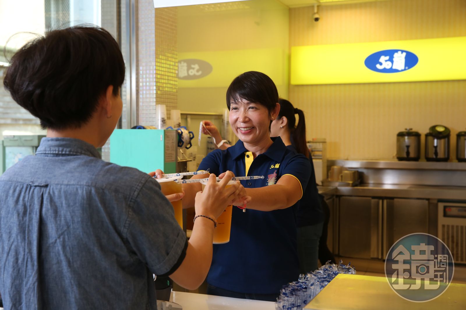 站上點餐檯,把最新鮮的手搖飲雙手奉給客人,馬雅芬笑說:「2002剛來台中創業時,我印象很深刻,有一個年輕的學生走進店裡就一直傻笑,點完茶後還在笑,我問他『你在傻笑什麼?』,他才說『以前在台南念書時很喜歡喝50嵐,現在終於到台中展店了,覺得好開心』,我才驚覺把一杯茶做到最好,除了能感動客人,也能感動自己。」