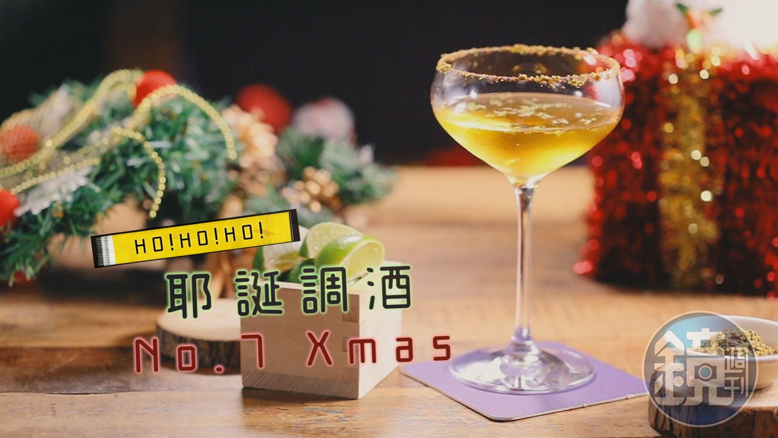 Jeff選用堅果粉和巧克力碎屑當杯飾,增添口感和香氣,也呼應冬天派對的主題。先用切半的檸檬摩擦杯口,再把堅果和巧克力沾在杯口就行了。最後在杯裡灑上檸檬皮絲,蜂蜜堅果香甜中帶有檸檬清爽的「No.7 Xmas」就完成了!
