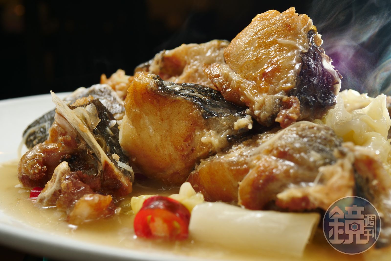 「青石老炒酸菜」取膠質豐厚的魚頭和澎湖酸菜一起爆炒,自然果酸味提出魚肉鮮甜,魚皮Q得像豬腳。(時價,圖中約1,080元)澎湖酸菜以高麗菜醃成,口感更加脆甜,有自然酸香。絕對要吃的招牌料理,還有從開店熱賣至今的「透抽米粉湯」,近期老闆將它升級成豪華版,除了有爽脆鮮甜的透抽,還加進鮮蝦、竹輪和蔬菜,要讓客人吃巧又能飽,再配條「香煎谷光魚」,就是最簡單的奢華。