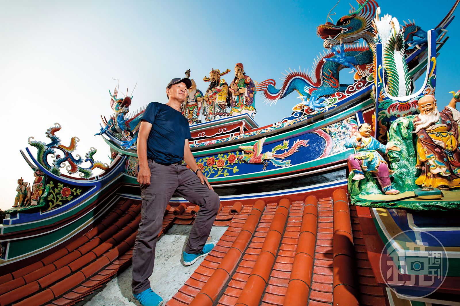 幾個小時過去,四支涼傘只完成一支,但剪黏全是慢工細活,急不得。經他巧手點綴,只見祥龍騰雲駕霧生動逼真,連爪子都張揚得極富動感,從遠方望去,整間廟宇多了靈動的霸氣和細膩的藝術氣息。
