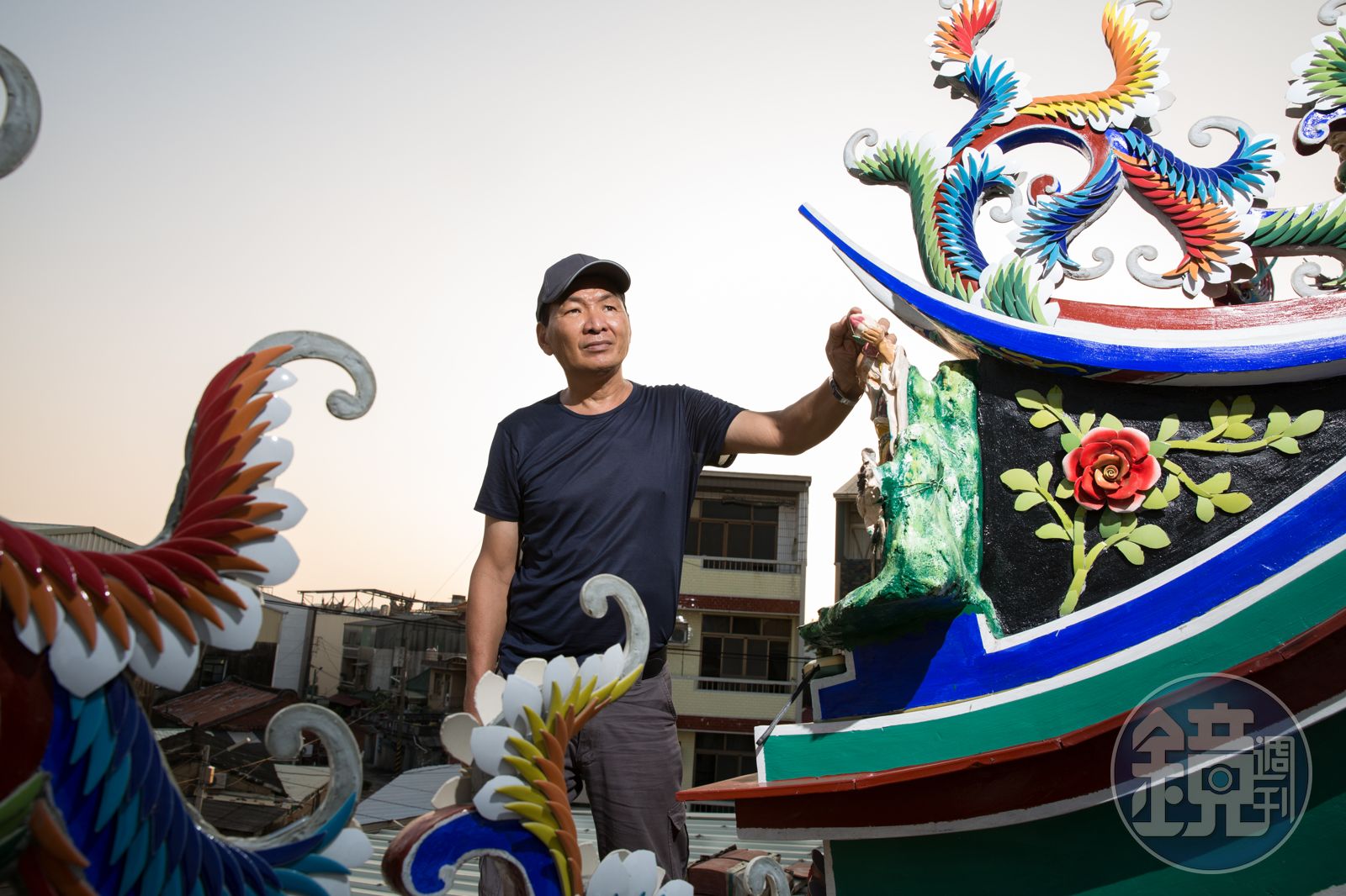 台南西門路上沙淘宮傳來齊力吆喝聲,3、4名工班師傅準備將剪黏好的涼傘吊上廟宇簷口下方位置,蹲在廟前階梯的葉明吉負責最後修飾,以畫筆為涼傘上龍頭點睛畫表情,花了整個下午精雕細琢,一雙龍眼活靈有神,他鴨舌帽下的專注表情卻滲出苦澀:「我很歹命,後腦8公分傷口縫了10針,只休息2天,不趕快做的話,債主一堆。」